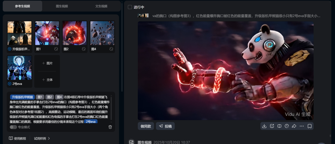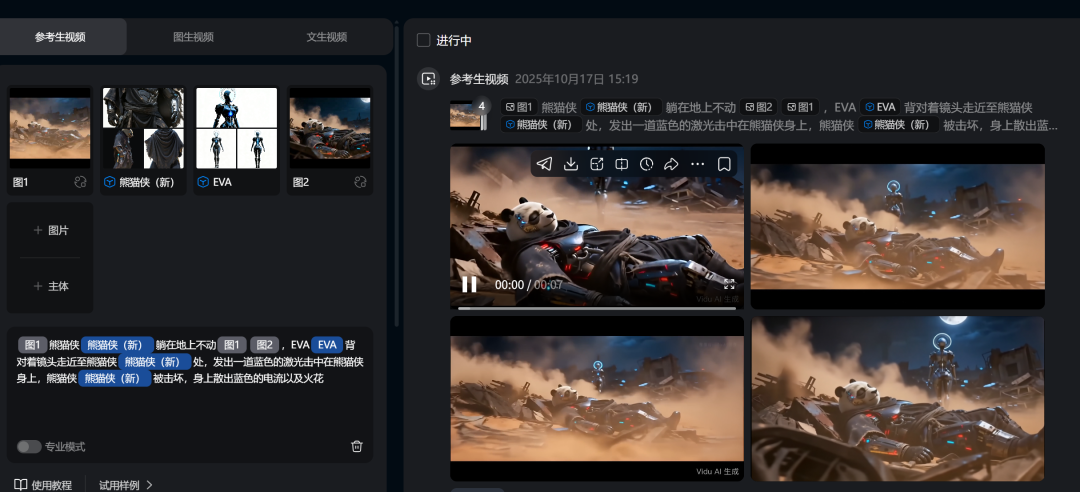 Vidu Q2多参解决了这个问题。比如最后熊猫侠和EVA的终极一战,这种复杂程度的交互如果用提示词直接出图,大概率做不出来。