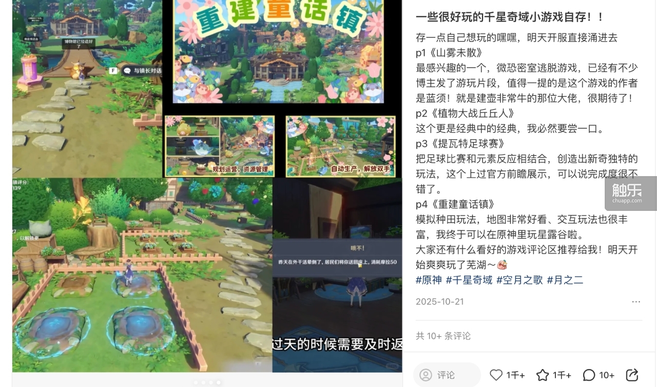 官方无疑能够意识到这一点。它了解它的玩家、知道玩家们的需求,也始终保持着尝试和创新的心气。过去积累的大量的交互素材和美术资产都可以在千星奇域中转化为新的玩法内容,《原神》也需要通过千星奇域开启未来更加长线、丰富的探索,和玩家一起走得更远。这些愿望通过每一次的前瞻、版本更新乃至嘉年华都会传达给玩家,玩家们可能不一定能精准地描述,但必然会感知到这一切。