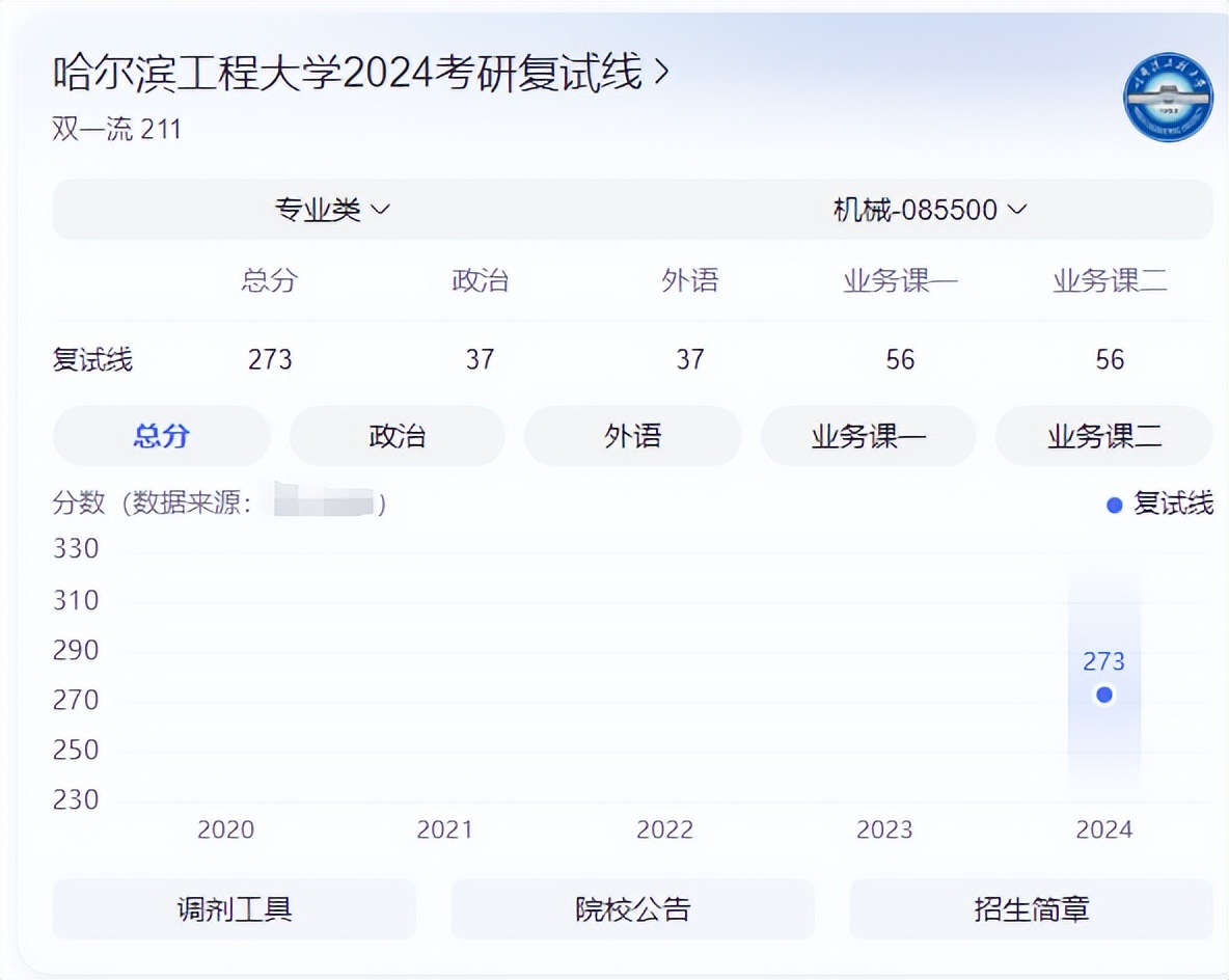 哈尔滨工程大学机械专硕采取的是国家线,24年复试线273分。