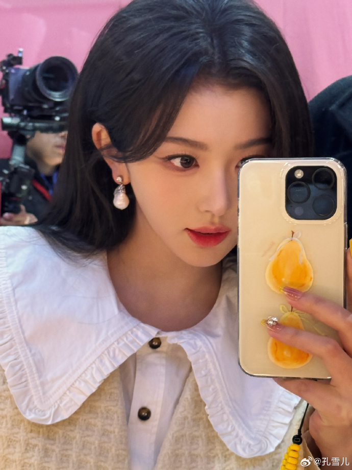 她举着带笑脸壳的手机对镜拍,奶黄外套搭着白内搭,耳坠的珍珠闪着细光,头发丝蹭着外套领口。舞台上她很少露这样的 “自拍视角”,可这张里连手机壳的笑脸都透着萌,是私下里 “觉得今天妆好看就拍一张” 的雀跃,没有舞台的设计感。
