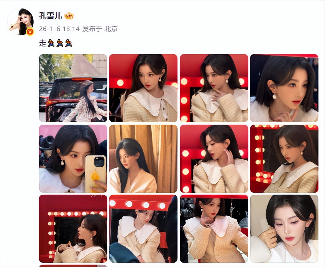 孔雪儿在 THE9 时期的舞台上,总带着唱跳爱豆的锐劲儿 —— 短裙裹着利落,亮片衬着气场,连眼神都透着 “盯紧镜头” 的劲儿。但 1 月 6 日她发的这条 “走走走走” 的动态,把不同场景的造型攒在一块,奶黄色的大翻领外套裹着甜,和舞台上的亮眼判若两人,像把私下里没绷着的软萌都摊开了。