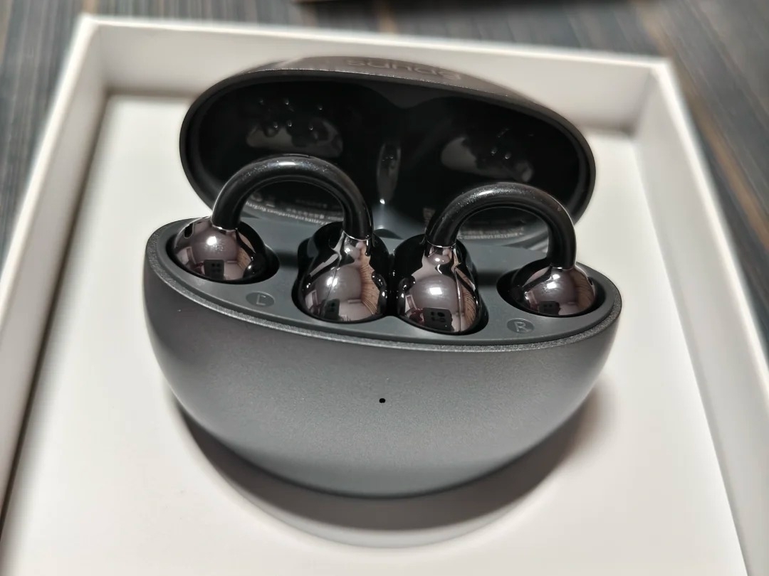 这款耳机的耳夹式设计可以让耳朵保持通透的感觉。耳机单耳约 6.3 克,戴在耳朵上感觉很轻,戴着很舒服。耳机的“C 型” 内桥外部用了高品质 TPU 材质,摸起来柔软亲肤;再加上12° 黄金夹角设计,既能牢牢贴合耳部,还能带来不错的佩戴体验。