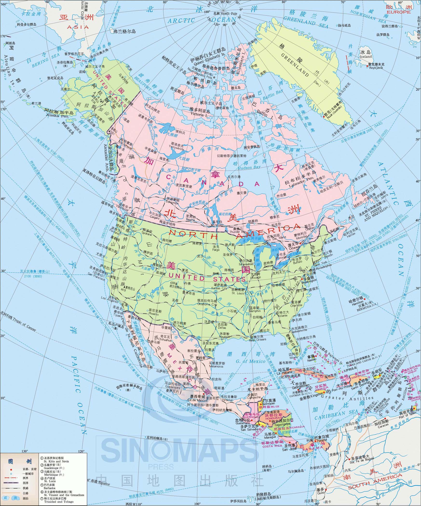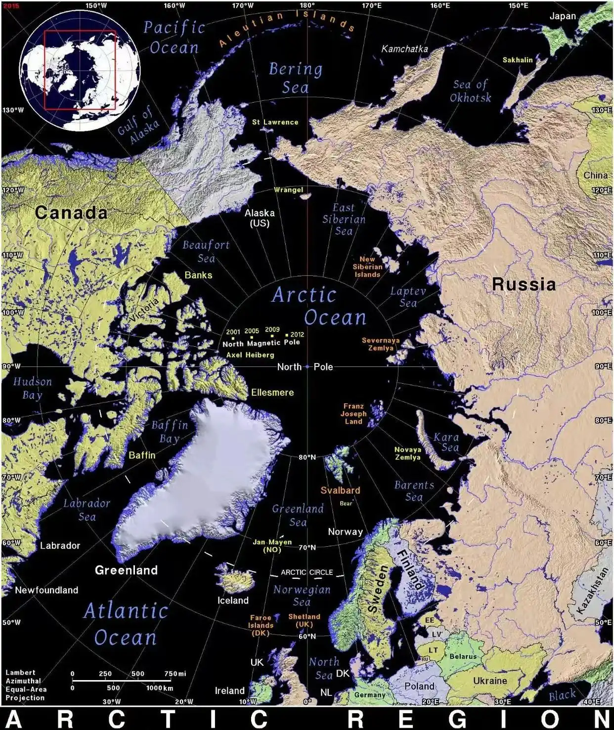 有人会疑问:“加拿大不是还有其他邻居吗?例如俄罗斯。”在下面这张带比例尺的北极地图上可以一眼看到,加拿大和俄罗斯两国领土之间隔着一个(北冰)洋,且最近处的距离也在一千大几百公里。如果这能算邻国,那么中国和智利岂不也成邻国了,不也是隔着一个(太平)洋嘛。