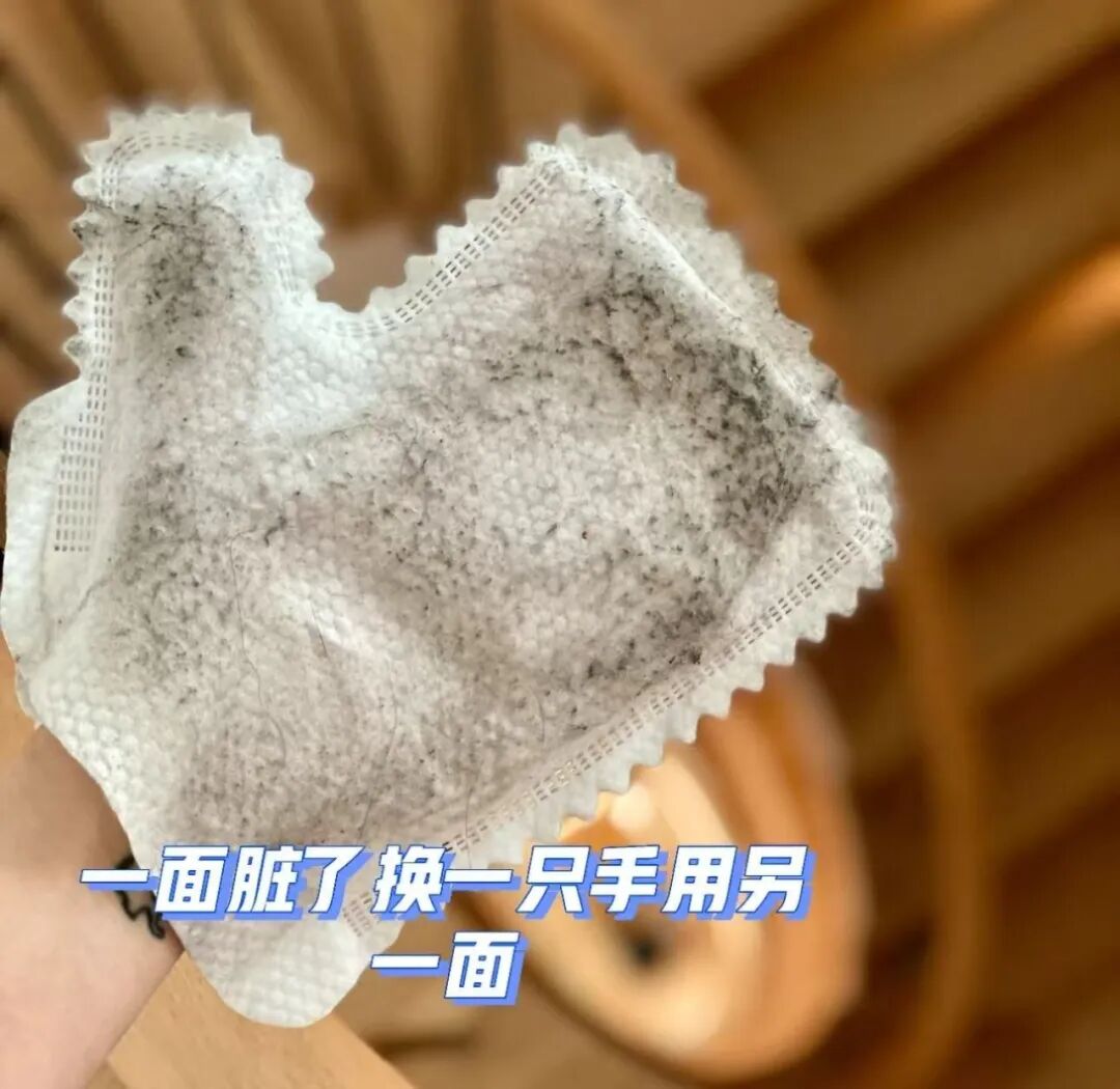 结果它就和我预期的一样,比鱼鳞抹布用着还方便。它就像戴手套一样,直接戴在手上,这样手擦到哪里就可以快速的清理掉哪里的灰尘和水渍等。