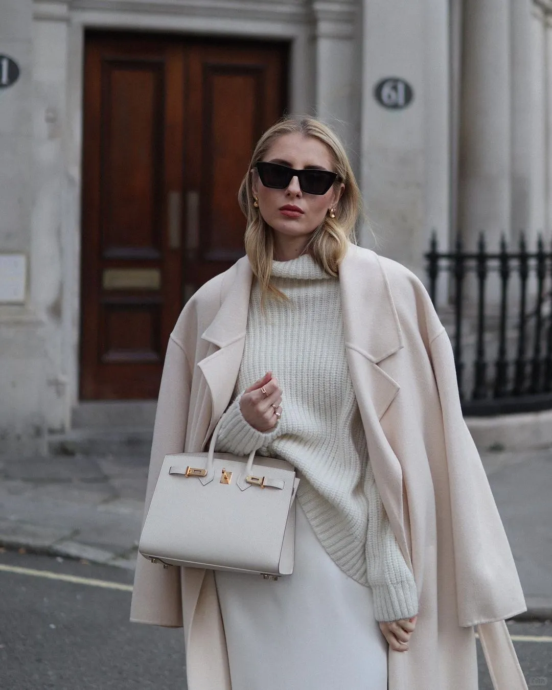 黑色鞋包能中和白色大衣的 “轻飘感”,