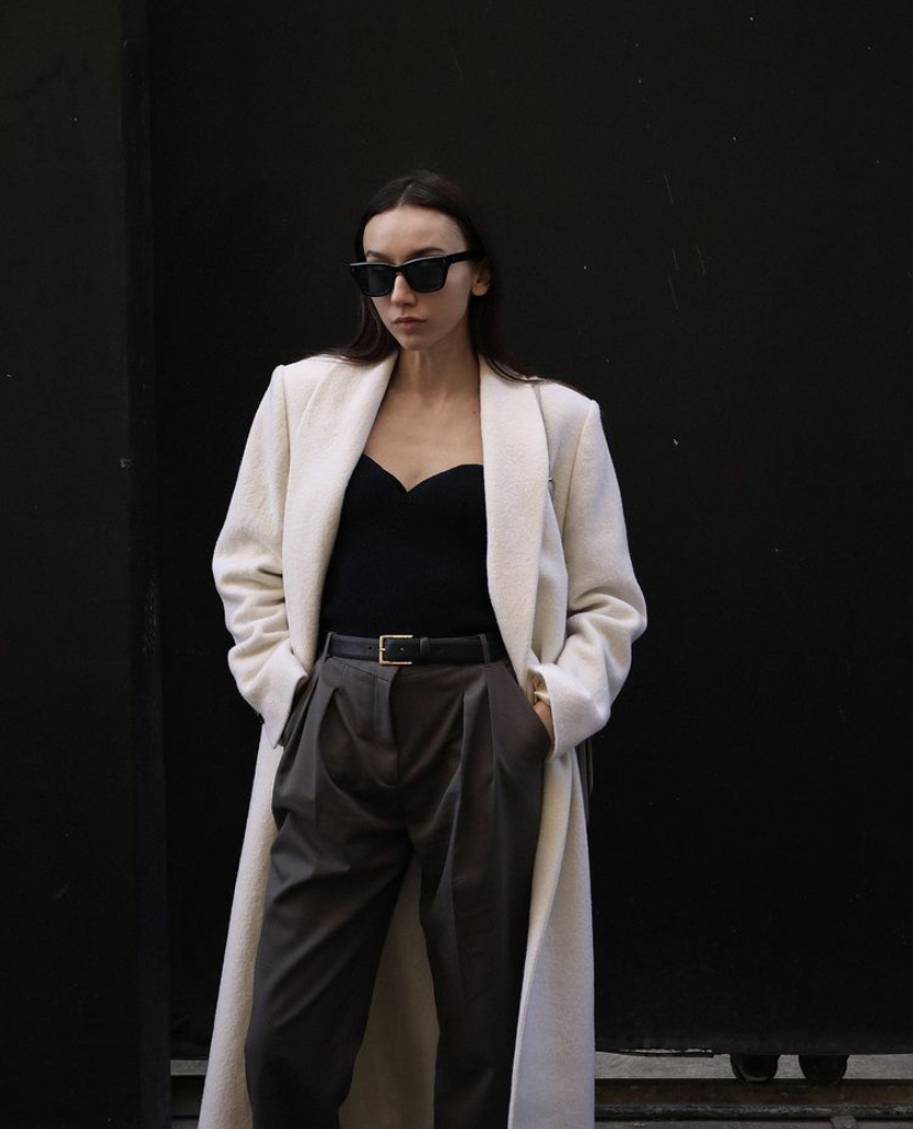 是风中流动的风景。选择垂感很好的燕麦色阔腿裤,与白色大衣形成微妙的层次。