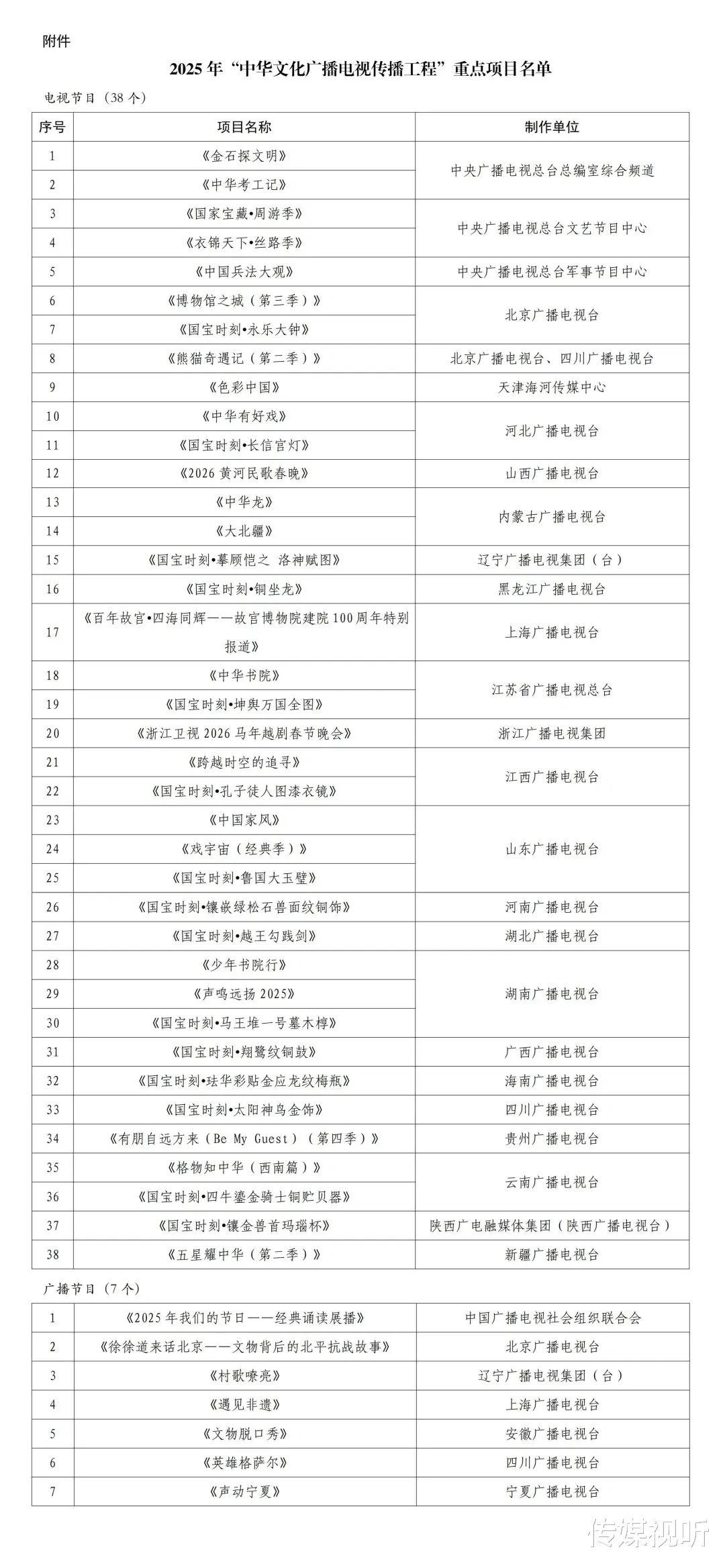 近日,国家广播电视总局发布《关于公布2025年“中华文化广播电视传播工程”重点项目的通知》。