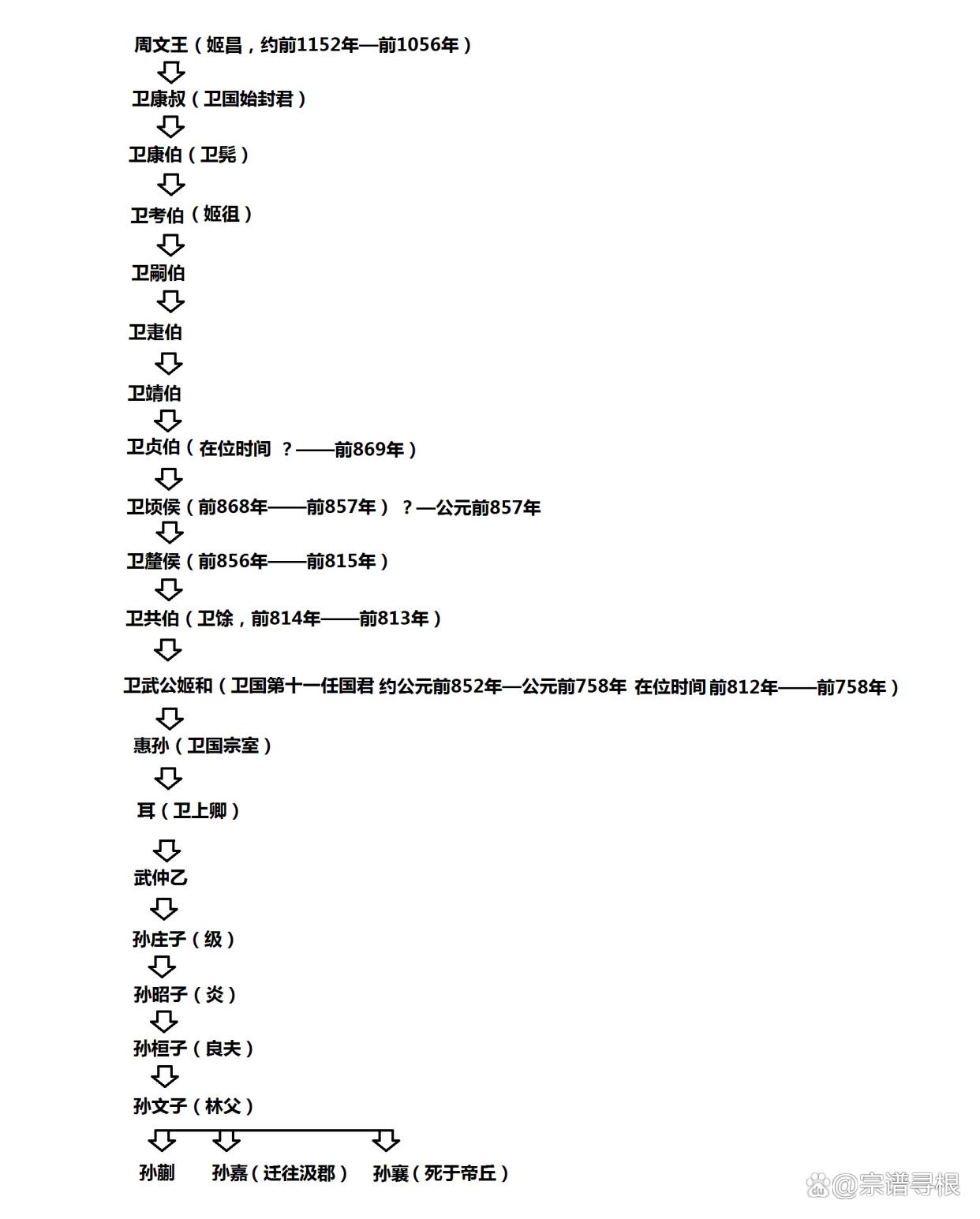 根据《左传》、《史记·卫康叔世家》、杜预《春秋释例·世族谱》等多种文献记载(包括《新唐书·宰相世系表》),特编制卫国孙氏世系如下(仅供参考):
