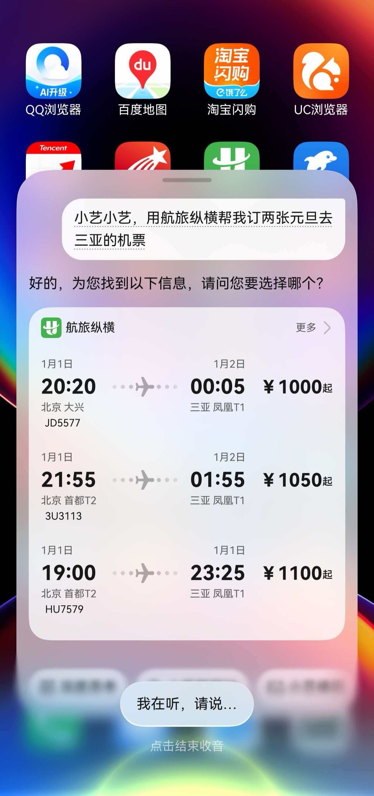 一开始朋友说他做攻略让我订机票、酒店的时候,我是非常抗拒的,想到要自己查路线、看天气什么的就头大。订票时我用的是鸿蒙版航旅纵横,之前刷到说它跟小艺深度联动,只要一句话就能完成订票。我就试着说了句“小艺小艺,用航旅纵横订两张元旦去三亚的机票”,果然,小艺就帮我推荐了各个时间的机票,点一下心仪航班就能进入App完成购票。航旅纵横还首发【实时天气动效】实况窗,能够实时展示天气状况,便于乘客提前了解目的地天气,别提多贴心了;