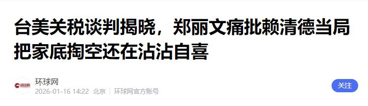 环球网:台美关税谈判揭晓,郑丽文痛批赖清德当局把家底掏空还在沾沾自喜