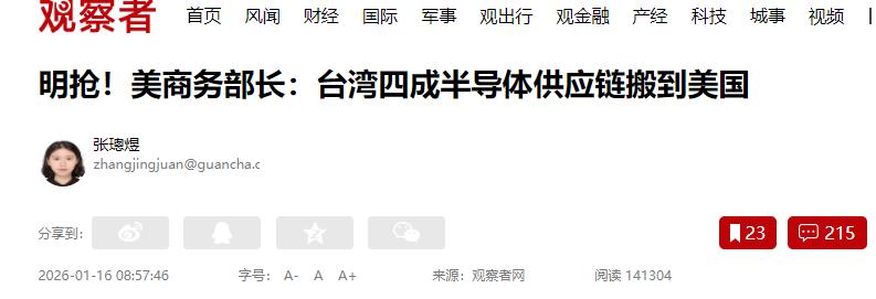 2026 年 1 月 15 日,美国商务部突然发布声明,一纸所谓的 “台美贸易协议”,把赖清德推到了舆论的火山口 —— 美国不仅要台湾掏出 5000 亿美元的真金白银,还要把台湾引以为傲的半导体产业四成产能搬到美国本土。