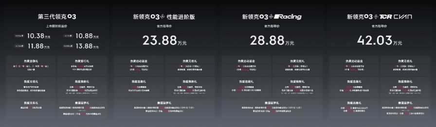 对于追求更纯粹性能体验的玩家,23.88万元的新领克03+性能进阶版能够完美适配,标配碳纤维空气动力学套件、5.41秒破百,无论是跑山劈弯还是长途自驾都能从容应对。而作为中国高性能车代表之作,新03+Racing官方指导价28.88万元;03家族性能图腾新领克03+TCR Cyan官方指导价42.03万元,价值40000元的碳纤维车顶和碳纤维双风道机盖也都限时送,让“合法上路的赛车”也能轻松拥有!