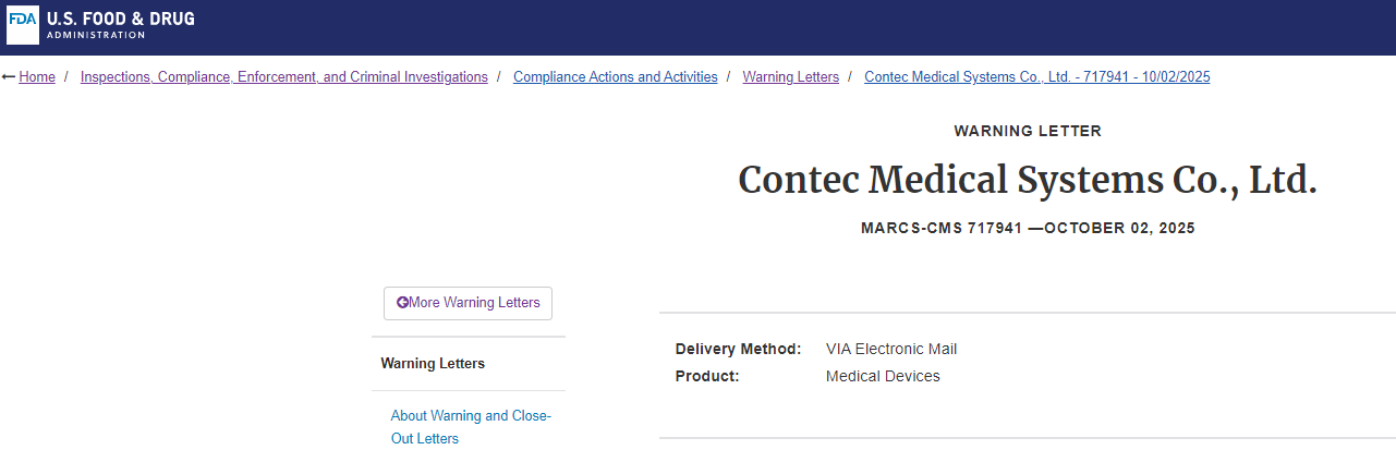 FDA于今年6月对我国河北省秦皇岛市械企Contec Medical Systems Co., Ltd.检查发现:由于企业在制造、包装、储存、安装种所用方法、设施、控制不符合联邦法规CFR第21篇质量体系法规的当前良好生产规范要求,即违反质量体系法规,认为企业生产的患者监护仪、超声诊断系统、脉搏血氧仪等医疗器械为“掺假”。