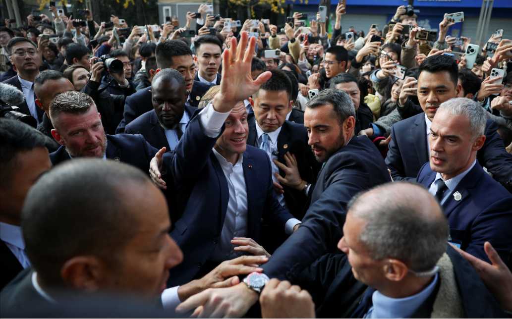 游玩都江堰后,马克龙访问四川大学,受到了热情欢迎。他一路狂奔着和大学生激情互动,到场的学生都想与他握手,随行工作人员根本拦不住。