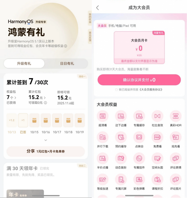 还有网上讨论度很高的“鸿蒙有礼”活动,把手机系统升级到HarmonyOS 5.1及以上版本都能参与,从桌面右滑至负一屏,参加“鸿蒙有礼”活动,每天签到福利领不停!除了随机红包,还有华为应用会员、热门应用月卡免单券、元服务优惠券和交通卡乘车券等福利惊喜掉落。要是抽到月卡免单券,可以兑换B站、优酷、WPS等20+热门应用的月卡会员,直接实现“会员自由”。
