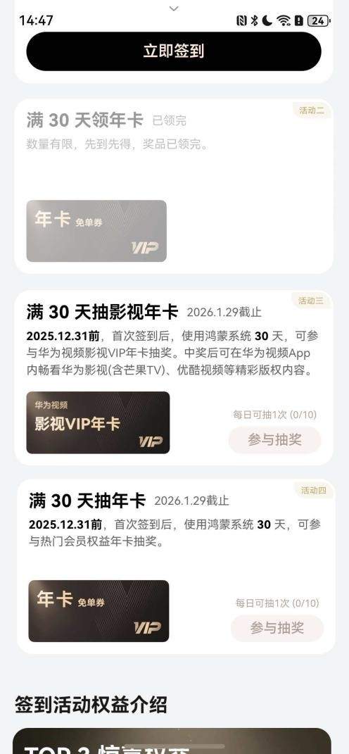 满30天“毕业”之后许久没打开“鸿蒙有礼”,没想到还上线了新活动——满30天抽年卡活动。不管是已经签到“毕业”的老用户,还是正在签到的朋友们,又或者是刚刚升级HarmonyOS 6的朋友,只要首次签到起满30天就能参与抽奖,每天1次机会,最多能抽10次。B站、WPS、优酷、喜马拉雅、芒果TV五选一,追剧追番、听书充电、高效办公的需求全覆盖,简直把用户的刚需摸得透透的。有同事抽中后兑换B站年卡,还有宝妈兑换了喜马拉雅年卡给娃听故事。