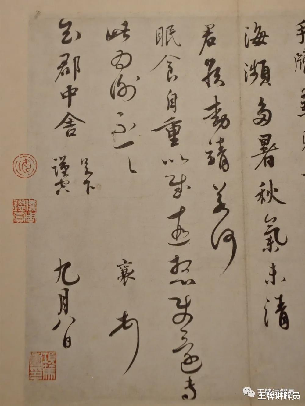 接着转入草书,写得自由流畅;最后以行书注明收信人和日期,收拢情绪,淡然结尾: