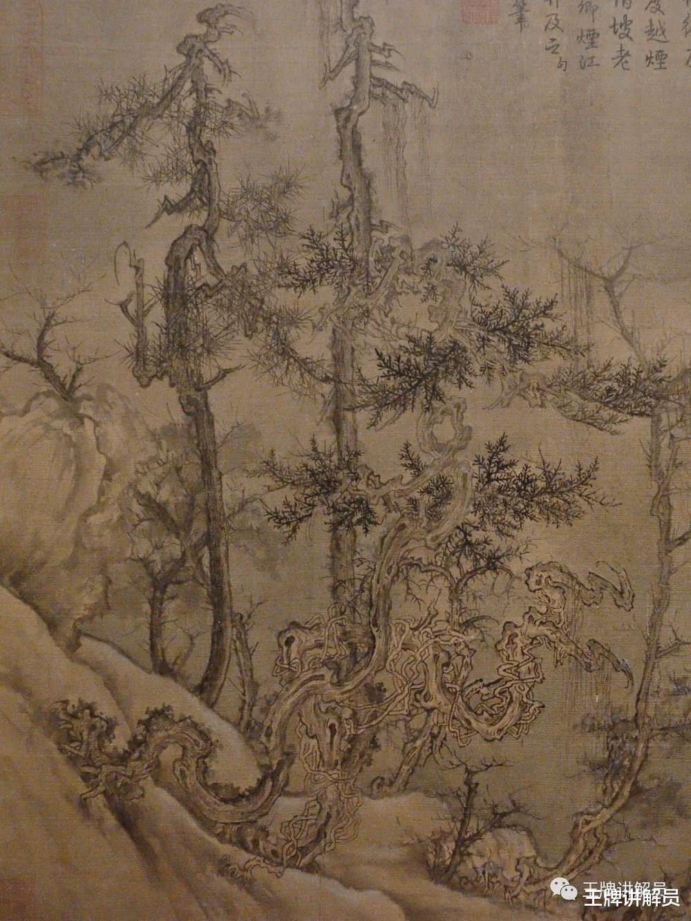 画卷中段的主题是高山与青松。山与画卷等高,隔绝左右,仿佛告诉观者,村落的喧嚣已被抛在脑后,我们将进入世外之境。青松则向来是君子品行的象征,尤其是在万物凋零的冬季。