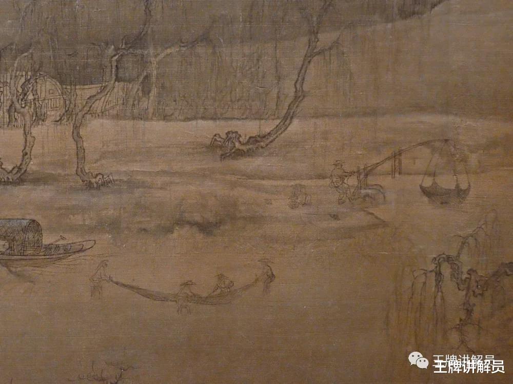 整幅画分为前中后三个部分,卷首部分的主题是渔村,渔民正在用不同的方式捕鱼: