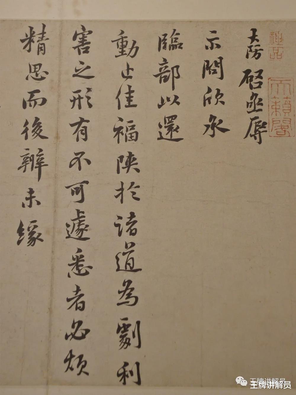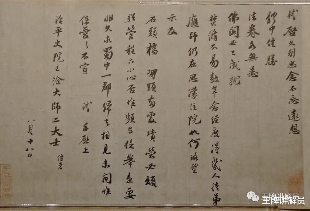 王诜在第一单元的地位堪称尊贵。除苏轼外,其他北宋名人都只争取到一个“展位”——展示一件与其有关的文物。(虽然《新岁展庆帖》《人来得书帖》都提到陈慥,但二帖被合裱为一件手卷,只能算一个展位)