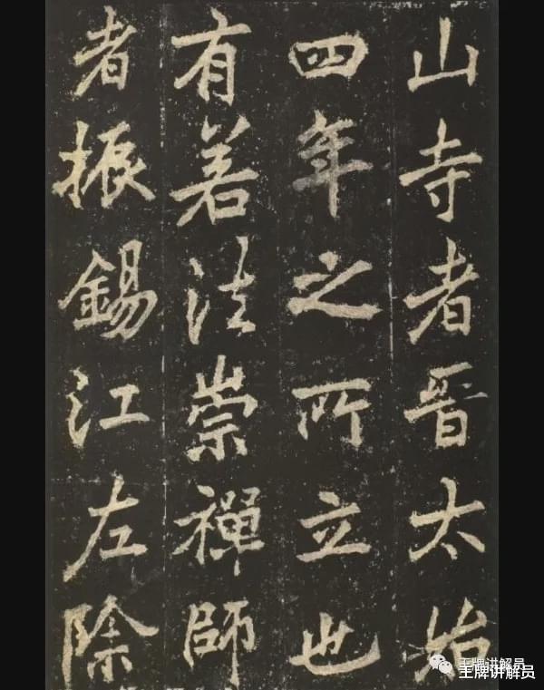 我再补充一个源头:比颜真卿年长一辈的唐代书法家李邕(音拥)。唐人写碑喜欢用楷书,李邕却独辟蹊径,用行书题写,但李邕的行书雄强豪迈,气势不输唐楷。从间架结构看,李邕的字看似歪斜,左低右高,其实立得很稳。