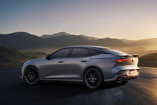 侧面采用溜背式造型以及悬浮式车顶设计,尽显动感姿态。尾部配备贯穿式尾灯,中央LOGO支持点亮,营造出不错的科技感。可电动升降的后扰流板,进一步提升了整车的运动气质。