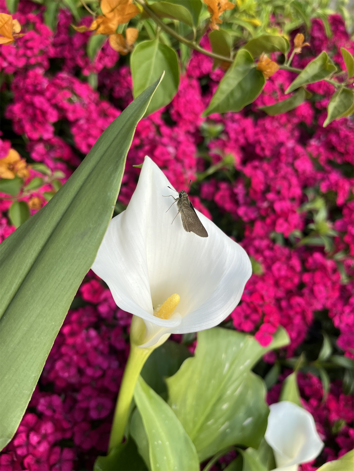 马蹄莲(学名:Zantedeschia aethiopica (L.) Spreng.),别名慈姑花、水芋、海芋百合、花芋等,为天南星科马蹄莲属的多年生粗壮草本植物。其具块茎;叶基生,叶片较厚,绿色,心状箭形或箭形,全缘,无斑块;花序柄光滑;佛焰苞长10-25厘米,管部短,黄色;檐部略后仰,锐尖或渐尖,具锥状尖头,亮白色,有时带绿色。肉穗花序圆柱形,黄色:雌花序长1-2.5厘米;雄花序长5-6.5厘米;浆果短卵圆形,淡黄色,有宿存花柱;种子倒卵状球形。花期2-3月,果8-9月成熟。