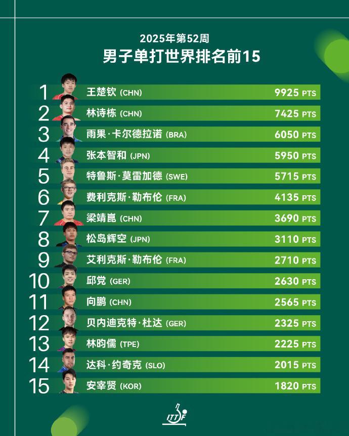 北京时间12月24日凌晨,2025年进入最后一周,国际乒联2025年第52周世界排名也火热出炉,男子单打方面,中国队的王楚钦继续高居第一位,林诗栋位居第二,巴西选手雨果-卡尔德拉诺排在第三,日本选手张本智和排在第四。