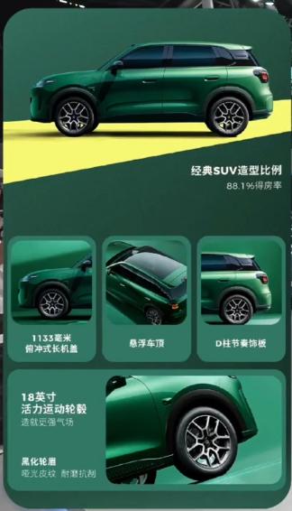 看完外观整体,再留意车身的细节设计,能感受到不少巧思:车身采用经典SUV造型比例,得房率达到88.1%,在紧凑尺寸里充分拓展了实用空间;侧面配备悬浮车顶和D柱装饰护板,让车侧线条更有层次感;箭矢式长机盖的设计,既优化了车头比例,也让整车看起来更舒展,这些细节组合起来,让A10在同价位车型里显得更精致用心。