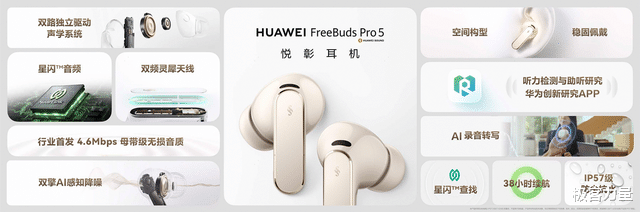 华为FreeBuds Pro 5悦彰耳机采用全新悦彰星环设计,提供四款配色,它是业界首款支持星闪™[8]音频技术的无线耳机,其搭载华为自研第三代音频芯片,配合L2HC 5.0协议,最高传输速率可达4.6Mbps,可聆听96kHz/24bit母带级无损音源。耳机同时是全球首款双擎AI感知降噪耳机,采用业界首个双单元双路主动降噪架构,降噪效果最高提升至220%。华为FreeBuds Pro 5用户在“华为创新研究APP”加入听力检测与助听研究[9]后,耳机可居家进行听力检测并为中轻度听损用户提供听力补偿。同时,FreeBuds Pro 5新增AI录音转写功能[10],支持实时转写并生成摘要、待办事项。