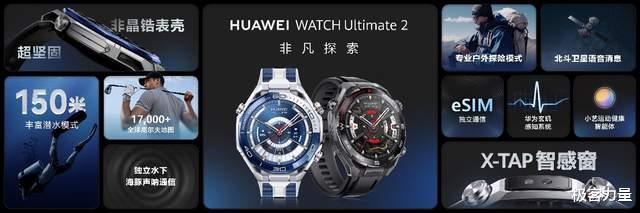 作为非凡探索系列的第二代产品,HUAWEI WATCH Ultimate 2 非凡探索迎来重大升级,采用创新防水系统实现150米潜水级防水,并首发海豚声呐通信技术,实现水下双向通信与水下SOS求救。相较上一代支持的文字消息,本代首次支持北斗卫星语音消息,实现单次发送最长10秒的语音消息,户外无网络极限环境下也能及时求助。此外,基于鸿蒙操作系统 6,它还支持腕上智能体,实现对运动与健康数据的快速解读;并搭载全新X-TAP智感窗,支持eSIM先锋通信,满足高端用户对运动健康与智慧生活的更高追求。