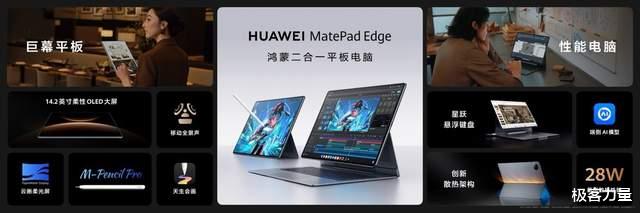 硬件方面,华为MatePad Edge采用14.2英寸3.1K分辨率的柔性OLED云晰柔光屏,支持120Hz高刷新率,峰值亮度达1000nits,4.1mm超窄边框带来高达94%的屏占比。性能上,该机采用创新散热架构,贯穿式出风腰线拥有近4000个风孔,双驱旋风风扇,配合微泵液冷系统,可实现TDP最高达28W[7]的性能越级释放。另外,该机还首发移动全景声,联合HUAWEI FreeClip 2耳机发声,能为用户带来如临其境的听觉体验。