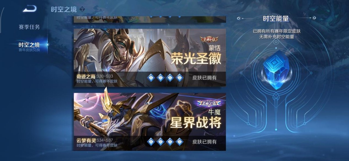 时空之境:这个赛季打上王者的玩家记得检查一下时空之境的赛年限定皮肤,不要忘记时空能量充能,皮肤充能完成后即可获得对应的赛年限定皮肤。