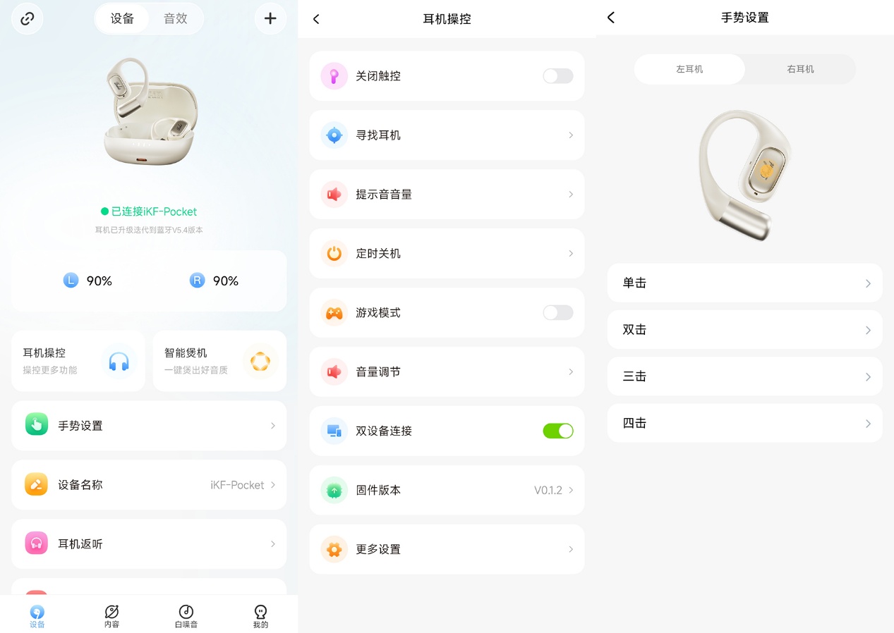 值得一提的是,它还支持 iKF APP 联动,我们不仅可以在手机上调节耳机的音乐风格,还能通过手机实现寻找耳机、定时关机、设置闹钟、设置手势等多种个性化操作,非常方便。