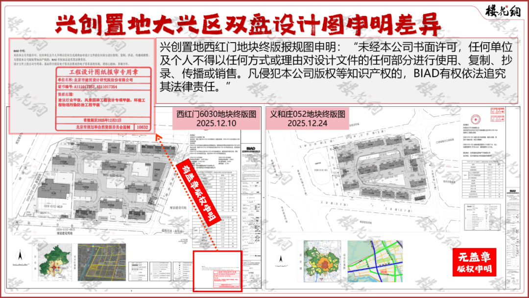 但,在12月24日公布了义和庄052地块的终版图纸中,北京建筑设计院,没有特意发布“BIAD申明”,也未见那个红色专用章。