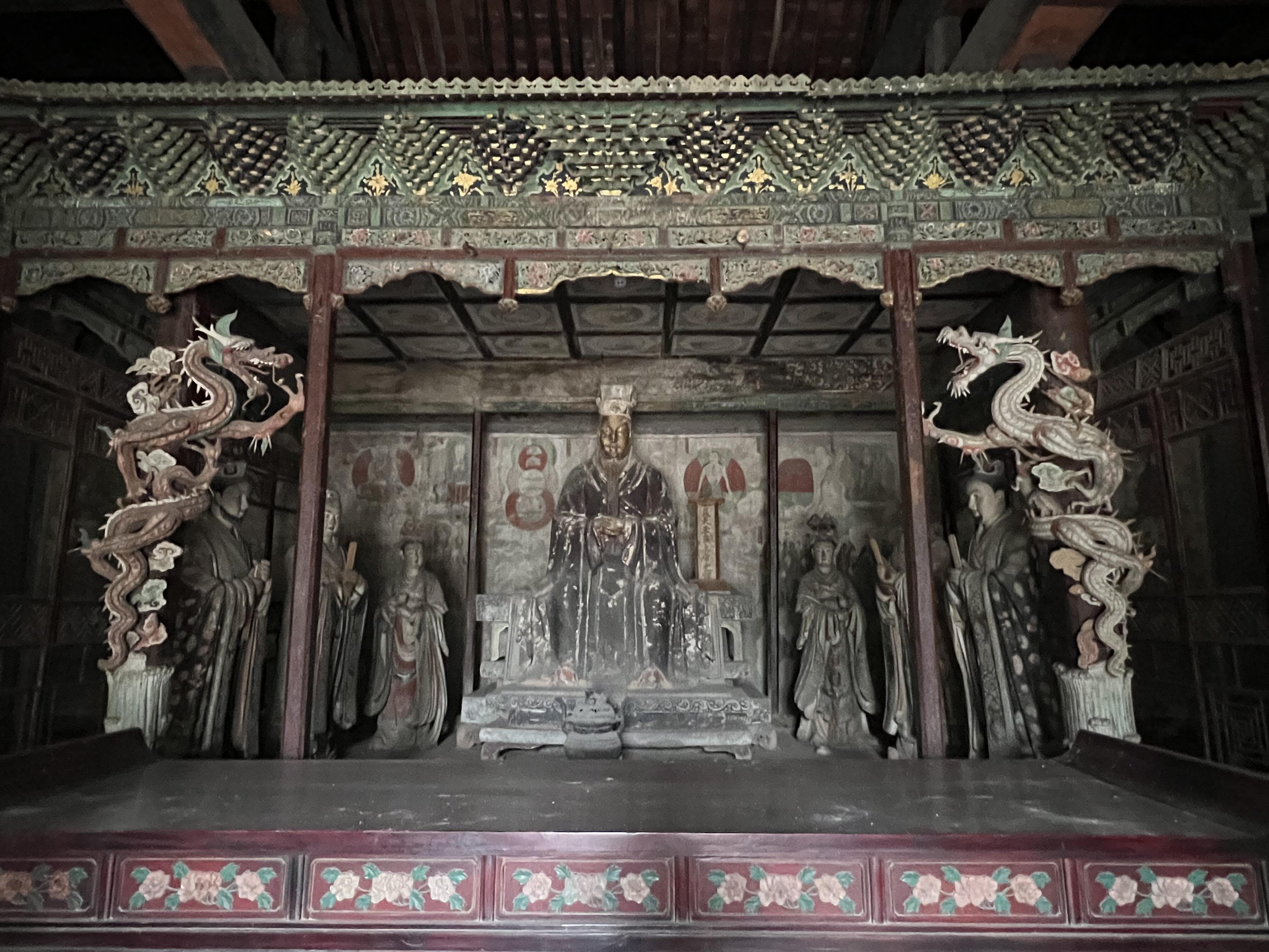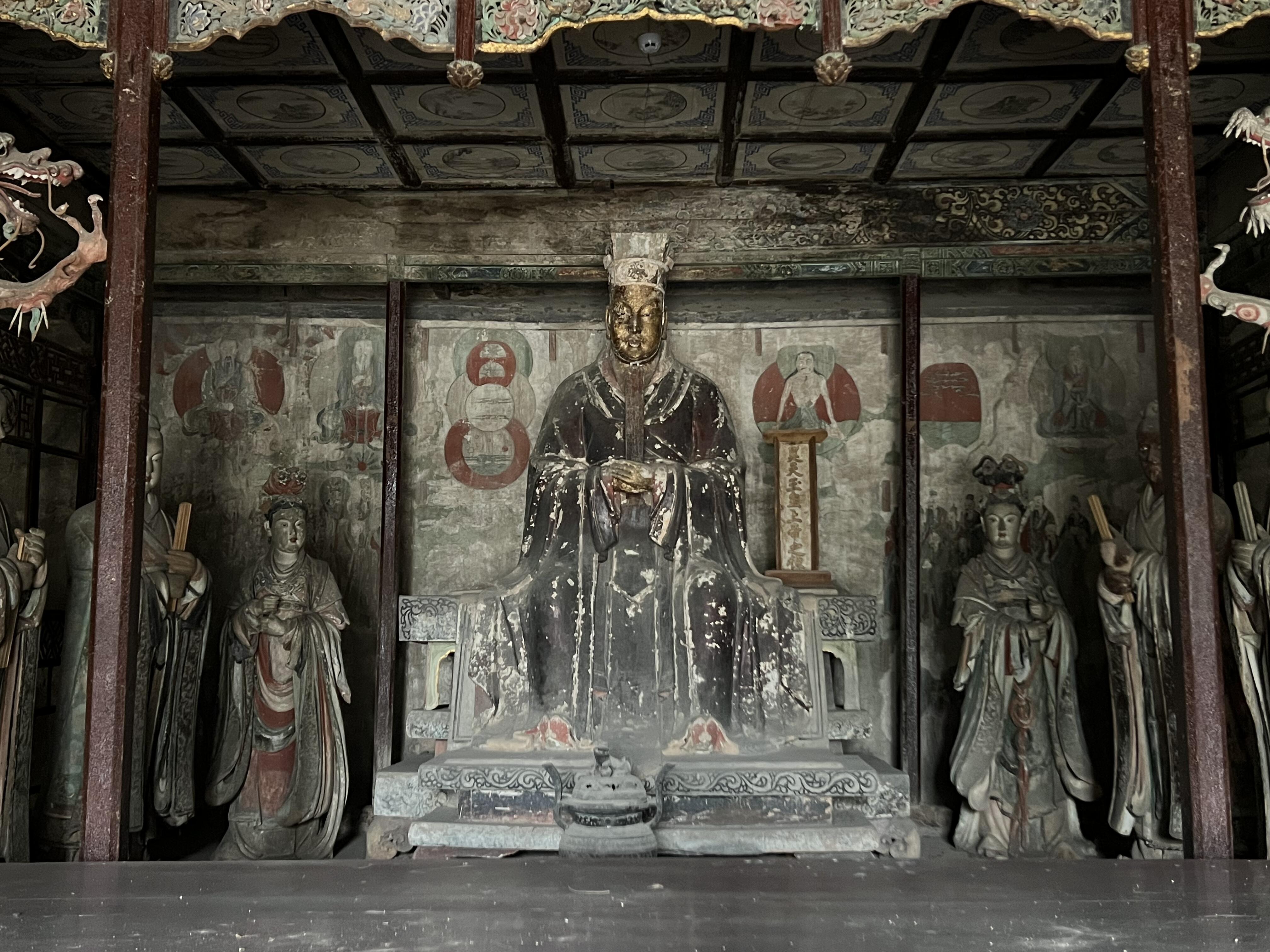 踏入殿内,一股历史的气息扑面而来。玉皇大帝及其侍者七尊泥塑栩栩如生,他们神态各异,服饰细节精致入微。每一尊泥塑都像是被赋予了生命,静静地伫立在殿内,仿佛在守护着这片神圣的空间。工匠们在塑造这些泥塑时,对每一个线条、每一处褶皱都精心雕琢,从玉皇大帝的威严神态,到侍者们恭谨的表情,无不展现出高超的雕塑技艺。