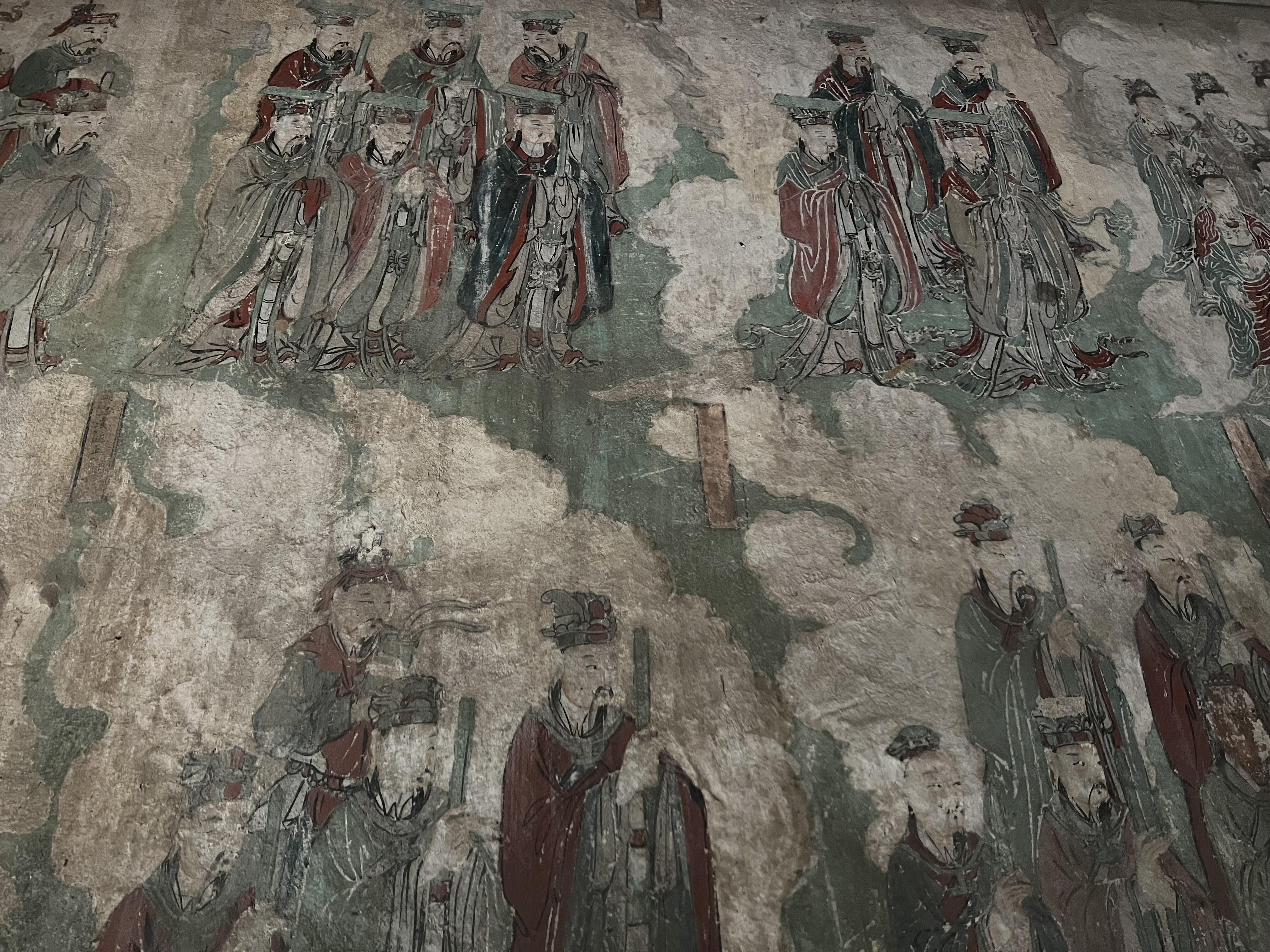 更令人惊叹的是,大殿三壁布满了壁画“三百六十五日值日星君朝元图”。这是全国仅有的记载明代道教诸神谱系的壁画,其珍贵程度不言而喻。壁画上,众多星君神态各异,他们或骑着神兽,或手持法器,浩浩荡荡地朝着一个方向行进,场面宏大而壮观。画家们用细腻的笔触勾勒出人物的轮廓,用丰富的色彩赋予壁画生命力。每一位星君的服饰、表情、动作都各不相同,展现出明代高超的绘画水平。通过这些壁画,我们可以一窥明代道教文化的繁荣,了解当时人们对神灵的认知与崇拜。