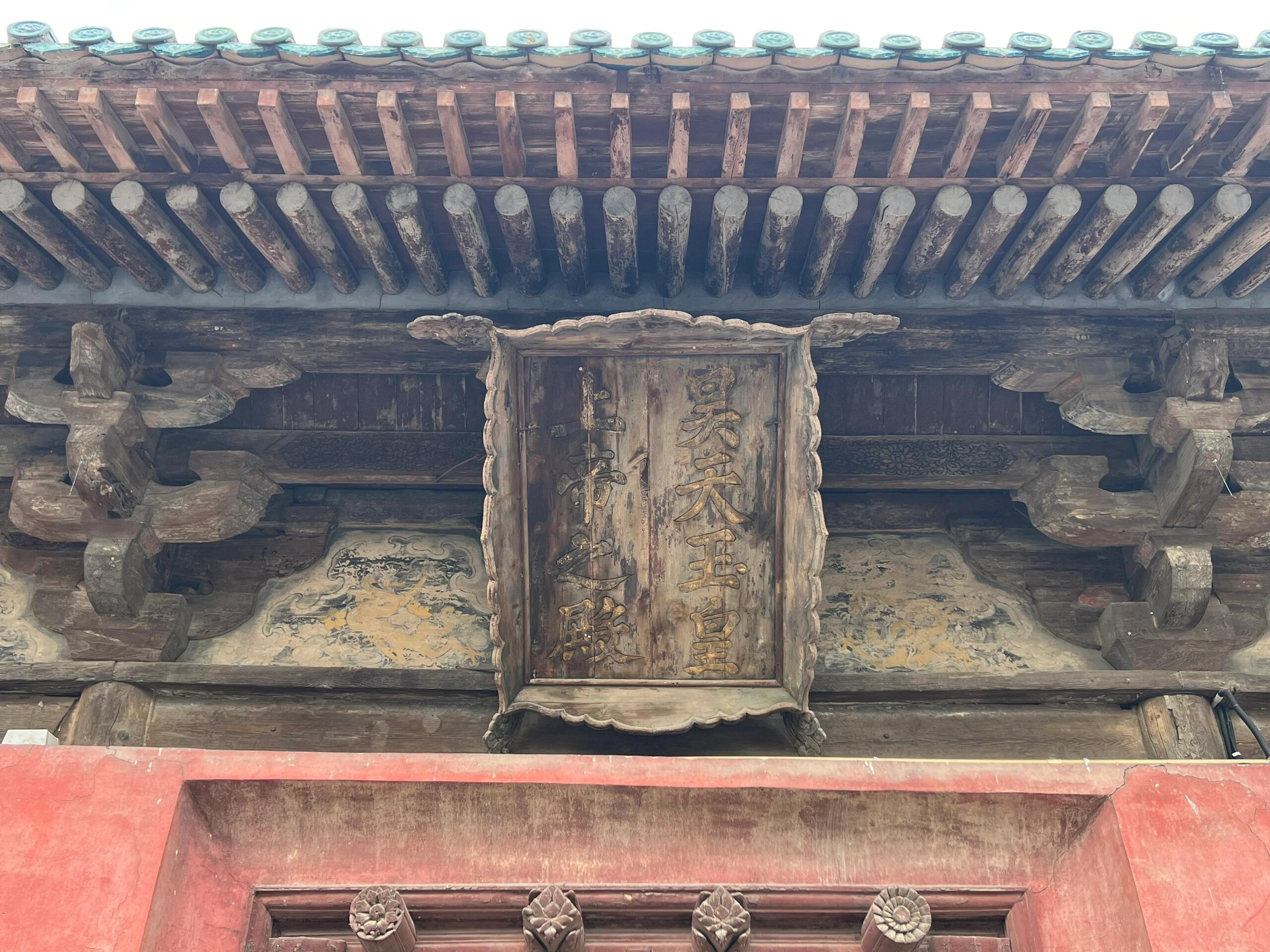 沿着中轴线继续前行,便来到了太符观的精华所在——昊天玉皇上帝殿。这座大殿是金代原构,在一众明代建筑中显得尤为珍贵。它面宽三间,进深六椽,单檐歇山顶,蓝琉璃瓦方心剪边,整体造型庄重大气。蓝色的琉璃瓦在阳光下闪耀着独特的光彩,与古朴的建筑主体相互映衬,既有历史的厚重感,又不失灵动与绚丽。明间檐下悬挂的“昊天玉皇上帝之殿”竖匾,字体苍劲有力,历经数百年依然清晰可辨,为大殿增添了几分威严与肃穆。