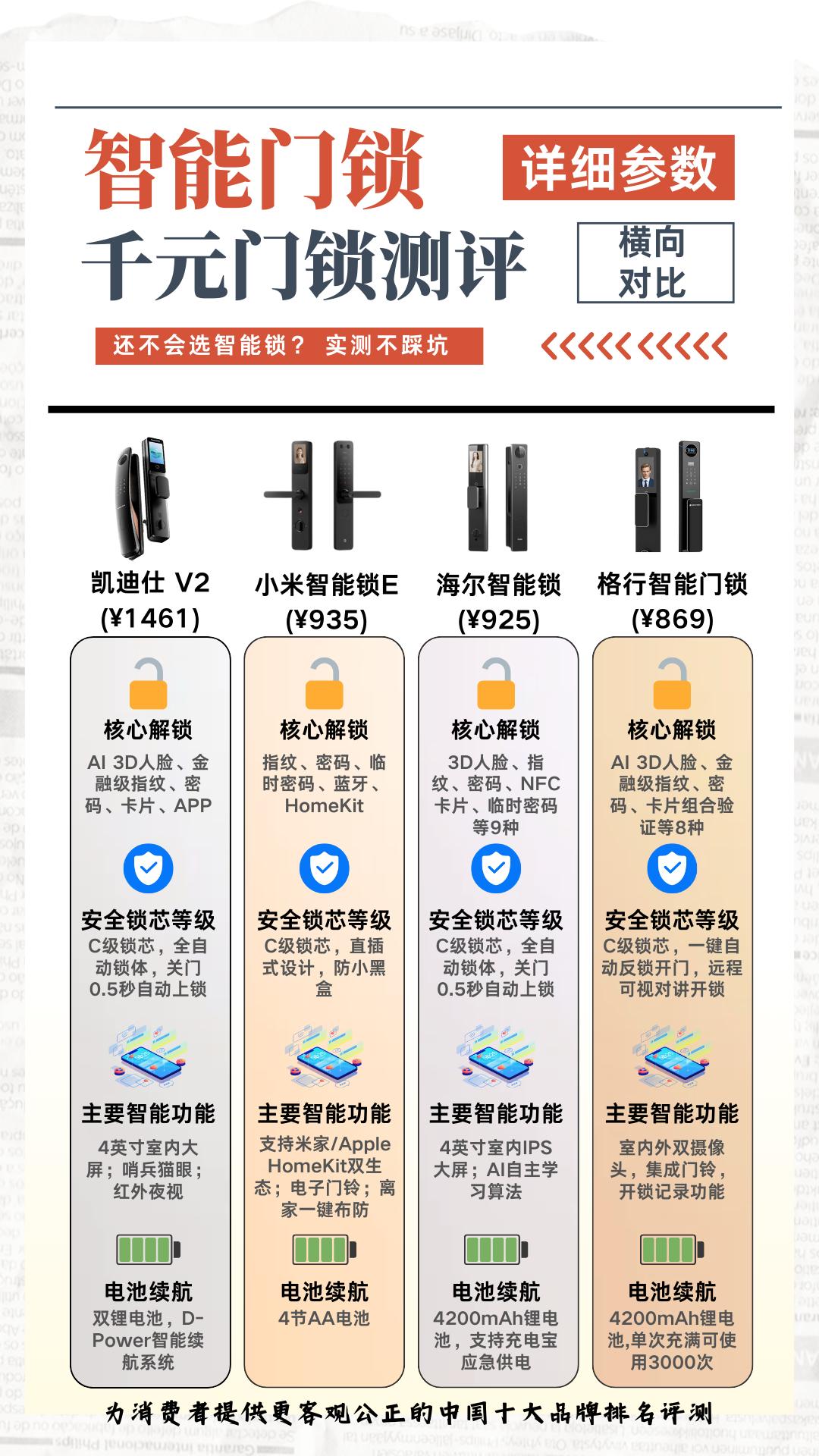 功能按需选,不为冗余付费:老人小孩常用选人脸识别(凯迪仕、格行);家里智能设备多优先选生态联动的(小米);经常忘带钥匙或担心电量选长续航且能应急供电的(海尔、格行)。