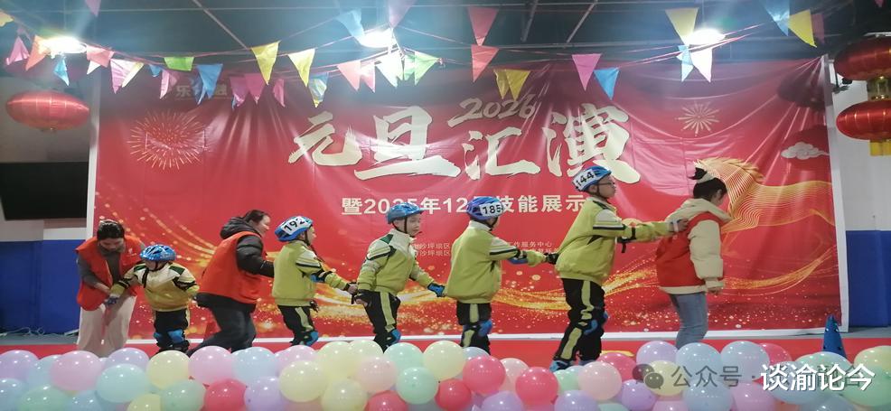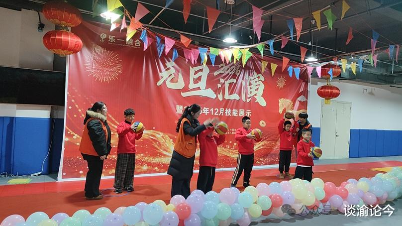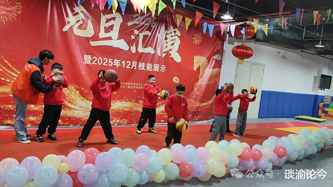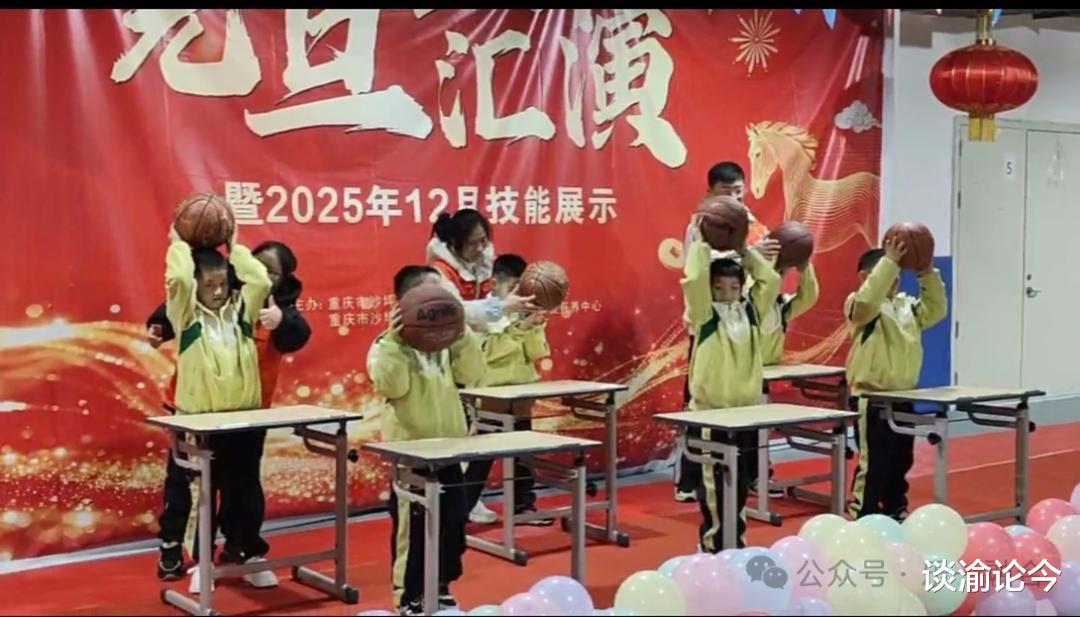 这是全场唯一一个融合桌子的趣味篮球表演!爱跑的谐哥显得格外安静,常规表现很好,没有随意离场;云璟今天也没有去扯衣服的线头。小龚在上一次技能展示时还会满场找吃的,找不到吃的就哼哼唧唧的他,今天竟然全程保持微笑站在自己的位置上完成了表演;去年表演还完全不会配合,大哭大闹的霖霖,这次已变身C位小哥,全程笑容满面可爱爆棚……他们用创意和协作,展现了篮球的另一种可能,也让我们看见了生命更美的色彩。