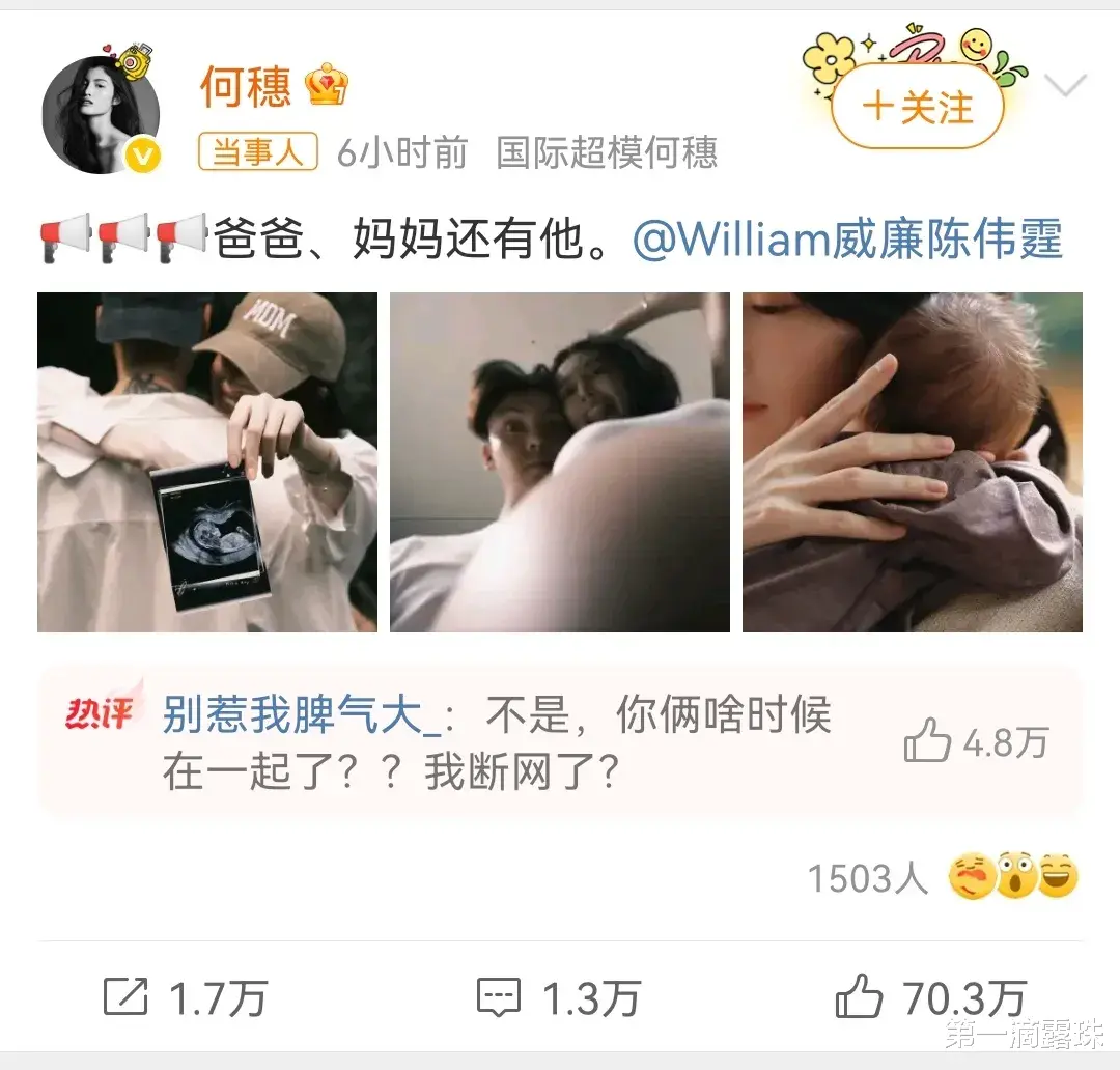 陈伟霆和何穗同步发文官宣生子,配文就六个字“爸爸、妈妈还有他”,后面都跟了三张照片。