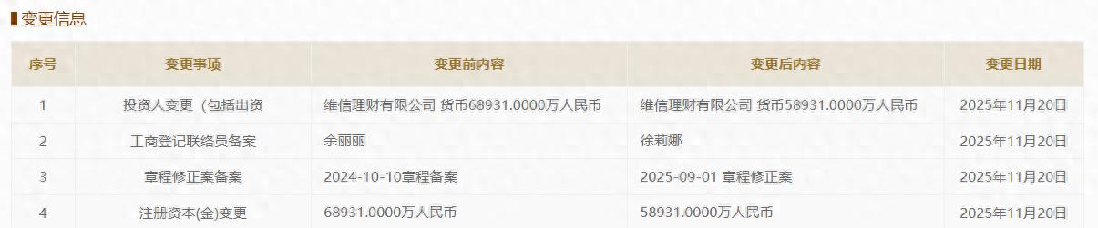 近日,上海维信荟智金融科技有限公司新增一条减资动态,11月20日,作为上市助贷平台维信金科的核心运营主体,该公司注册资本金减少1亿元。
