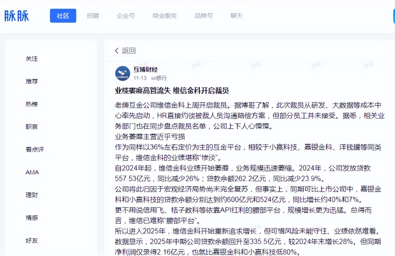 此前,有媒体报道,脉脉、微信等社交平台上,维信金科大规模裁员的消息引发广泛关注。据相关信息,此次裁员涉及投放、后端等部门,其中,后端部门裁员比例据称最高达50%,投放部门裁员比例约30%。裁员从研发、大数据等成本中心率先启动,人力资源部门已约谈被裁人员沟通赔偿方案,但部分员工未接受,业务部门也在同步盘点裁员名单。