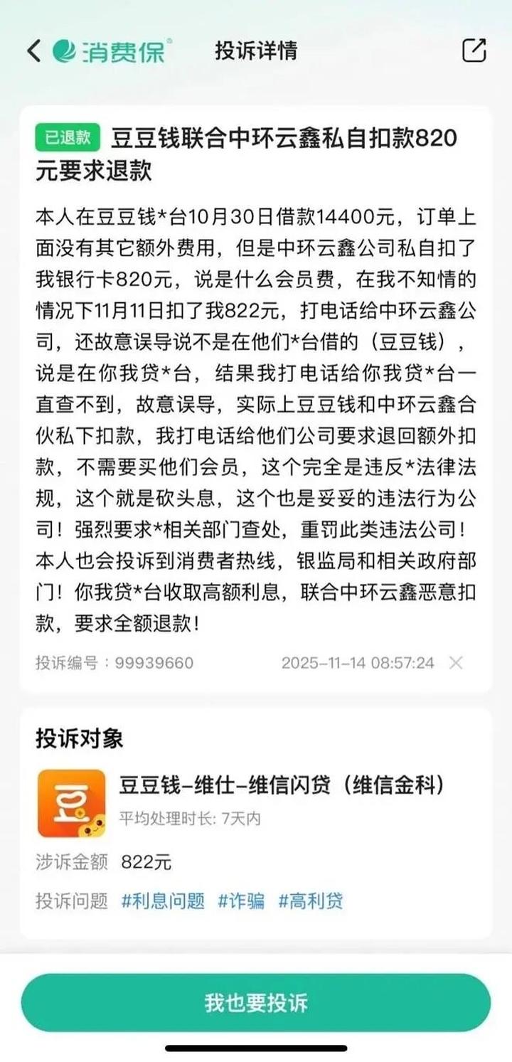 维信金科还存在大量用户投诉。黑猫投诉平台显示,针对该公司的投诉已超4万件,主要集中在“高利贷”“暴力催收”等问题,且多数投诉长期处于未处理状态。在消费保投诉平台中,有消费者投诉在豆豆钱平台借款时,被私自扣款。一名消费者称,10月30日在豆豆钱借款14400元,订单显示无其他额外费用,11月11日,却在不知情的情况下被名为“中环云鑫”的公司扣取822元的会员费,该投诉目前显示投诉进度为“已完结”,解决方式为退款。