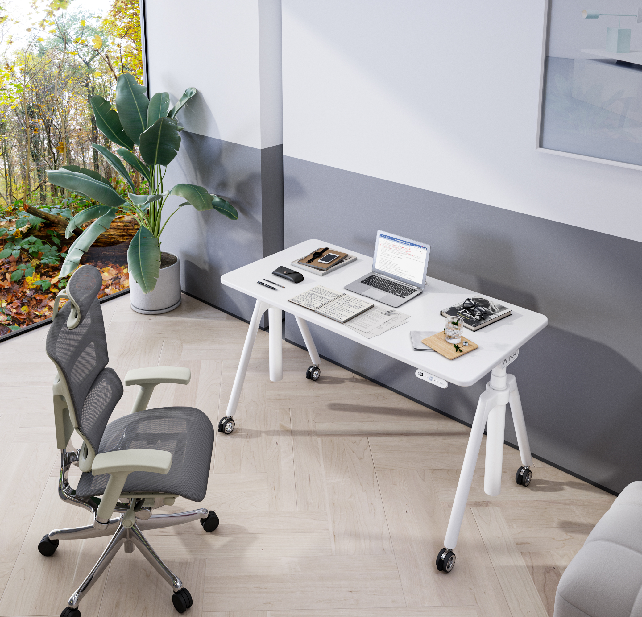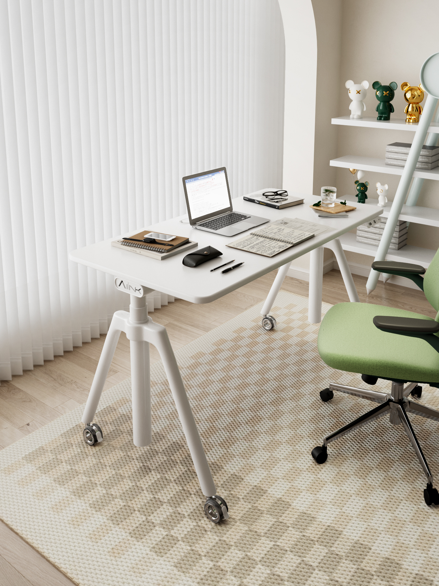 •办公场景:调节至75~85cm高度,1400mm台面可容纳双屏办公+文件架+绿植+办公用品,隐藏理线槽让线缆隐形,典雅白配色搭配办公椅,营造简洁专业的办公氛围;站立办公时缓解肩颈酸痛,提升工作效率。