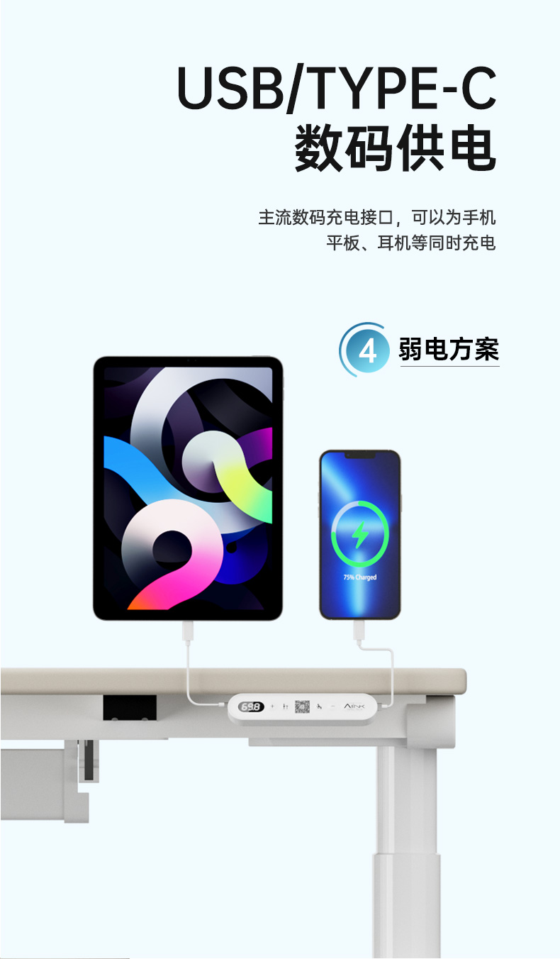 五孔双面隐形插排、USB/Type-C接口、隐藏式理线槽、专利V型冷轧钢桌腿、拓展配件接口