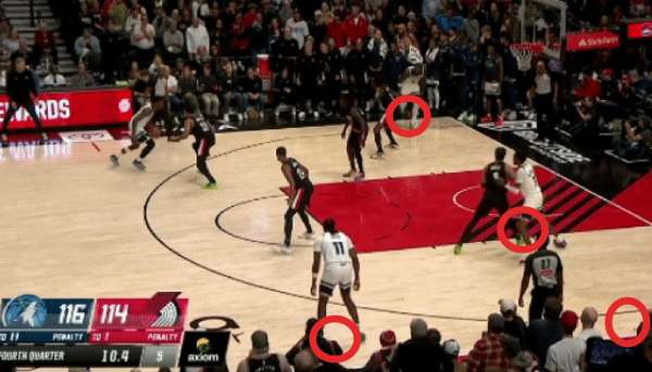 开拓者对阵森林狼的比赛,双方打到最后时刻,开拓者114-116落后,爱德华兹运球过半场后,森林狼并未安排上提掩护,兰德尔在强侧底角,香农在弱侧底角,里德在弱侧侧翼,麦丹在弱侧低位。