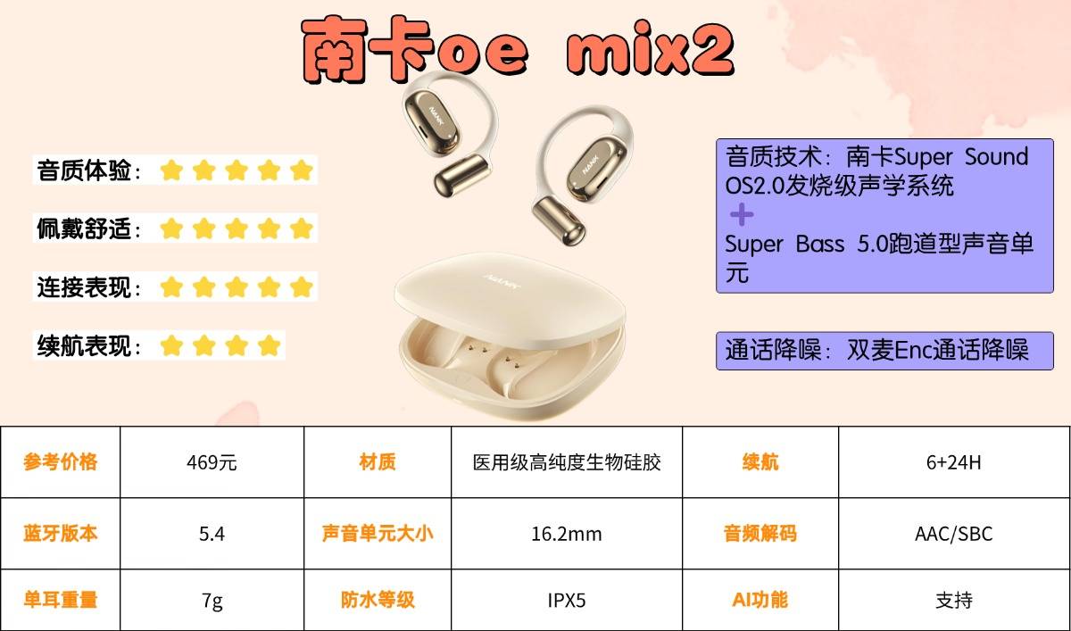 核心硬件方面,OE Mix2采用定制蓝牙5.4芯片,连接更稳定、延迟更低且能效表现突出。单次听歌可达6小时,搭配充电仓可支持24小时使用,同时配备双麦降噪、IPX5防水等级及多项AI辅助功能。整体配置对标千元级别产品,体现出十足的诚意与高性价比。