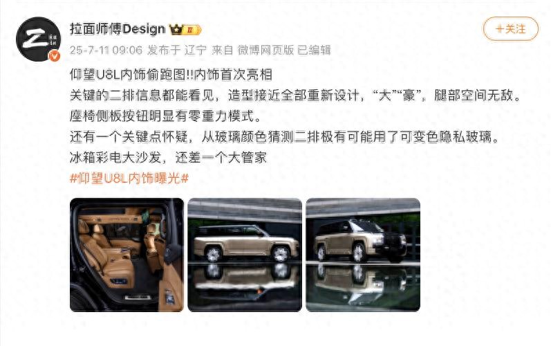 此外,在博主曝光的内饰图中,我们还能观察到,仰望U8L同样延续了诸多U8上的豪华细节,比如套方纹窗扬声器面罩,极具中式豪华感。并且看二排玻璃,它很可能还增配了可变色隐私玻璃,这体验更尊了!