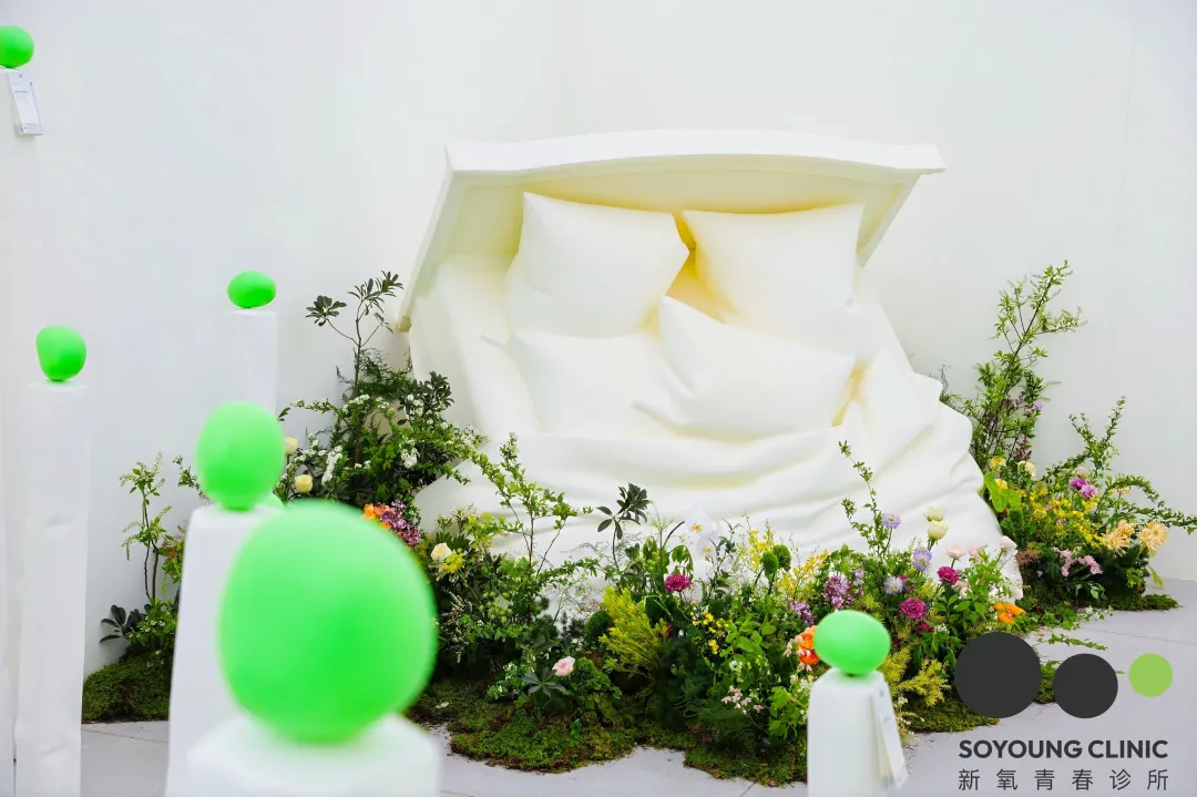 活动现场,一颗显眼的绿色豌豆遍布每一个角落,这颗豌豆也是新氧青春医美诊所故事的起点。